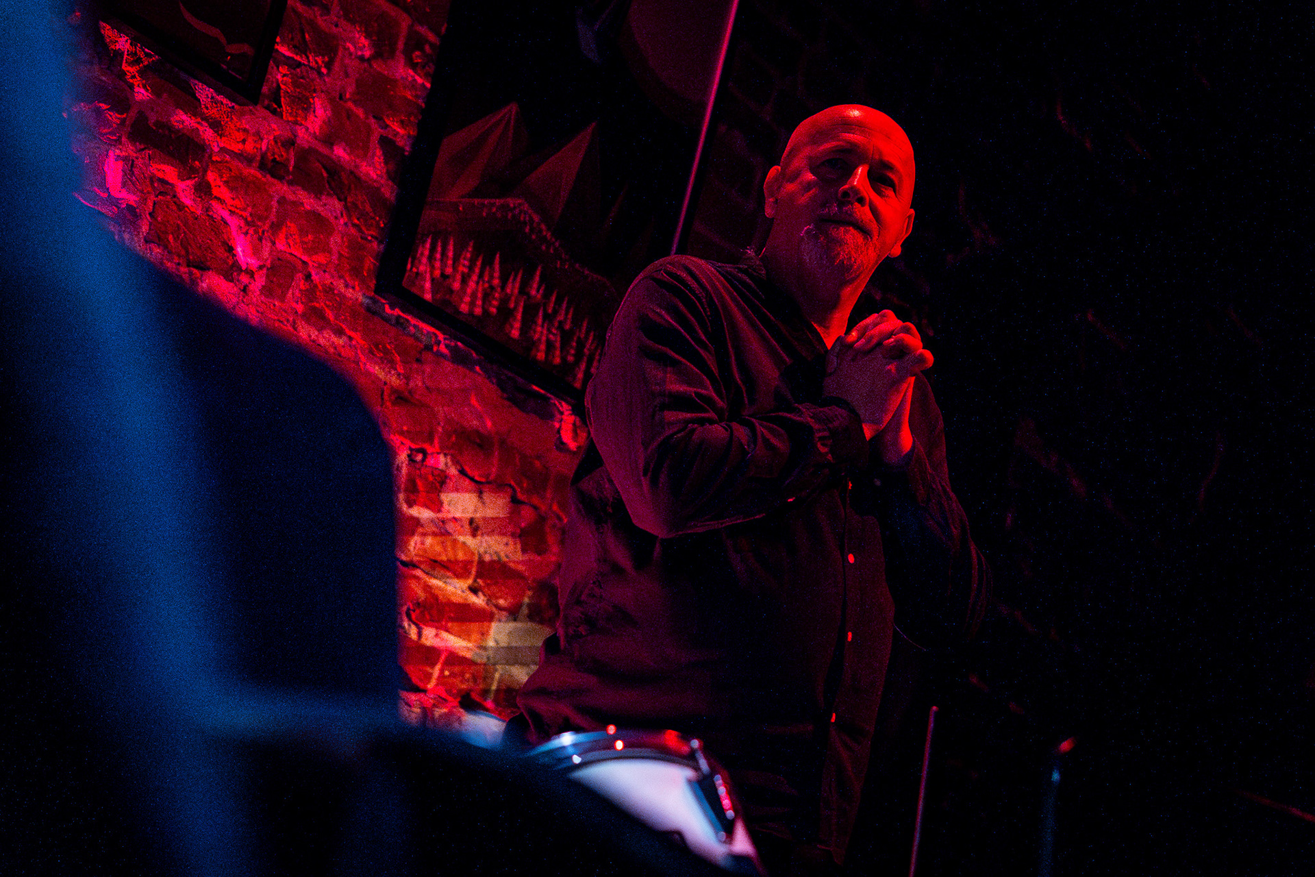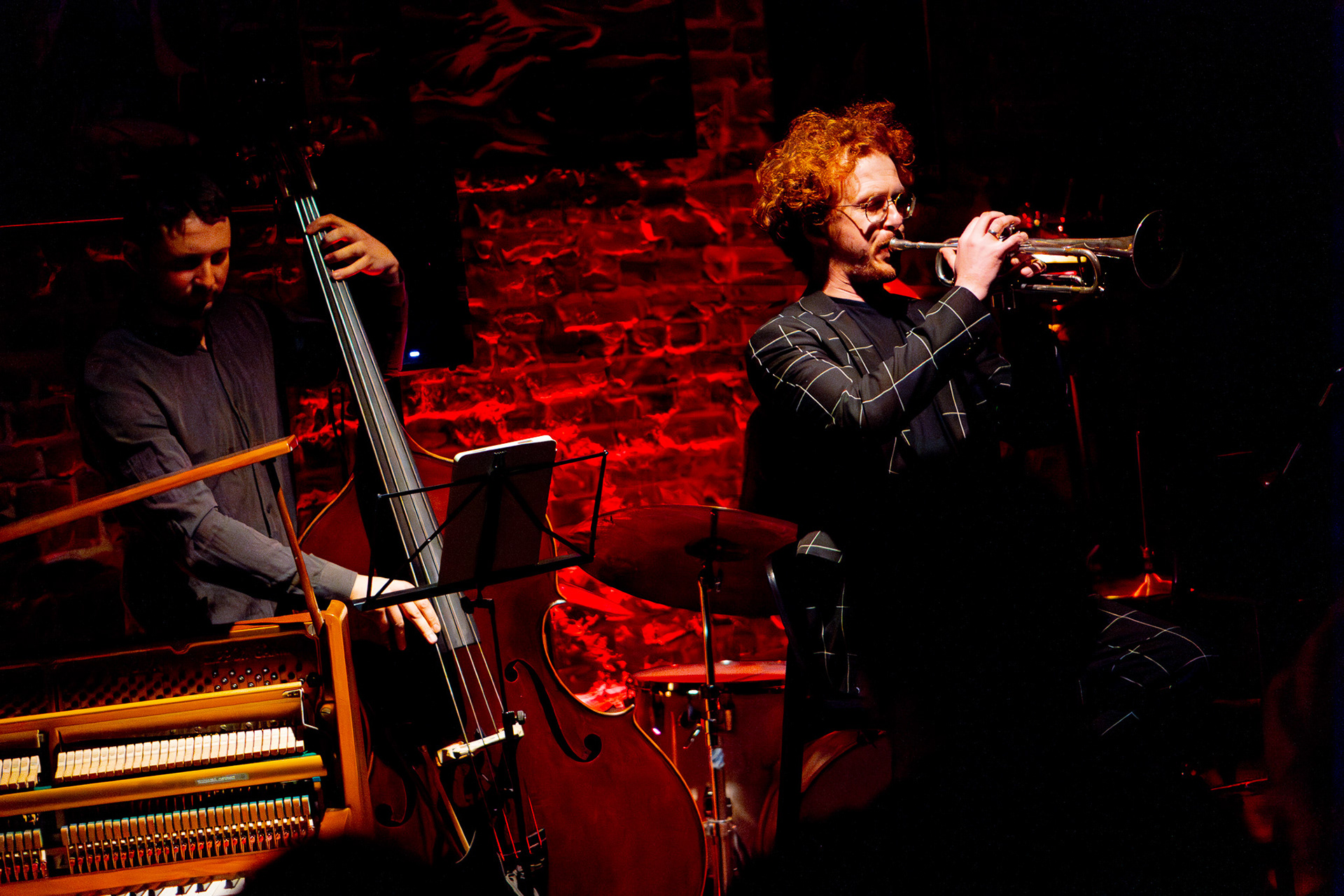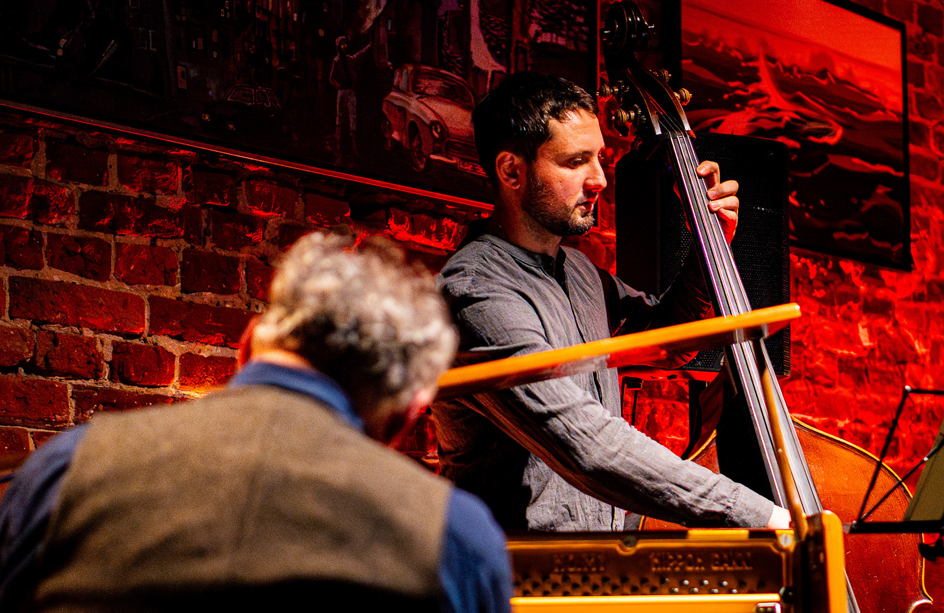 And suddenly — teleportation. From a Łódź courtyard straight into New York–Copenhagen underground. Darkness slowly parting, beams of stage light falling on a brick wall, a piano standing in the corner as if asleep, a drum set awaiting a touch, five of Piotrek’s paintings hanging like they’d always been there. Zero randomness. A minimalism so precise you feel that subtle hunger — as if everything were perfect yet just slightly too little, and at the same time, exactly right.