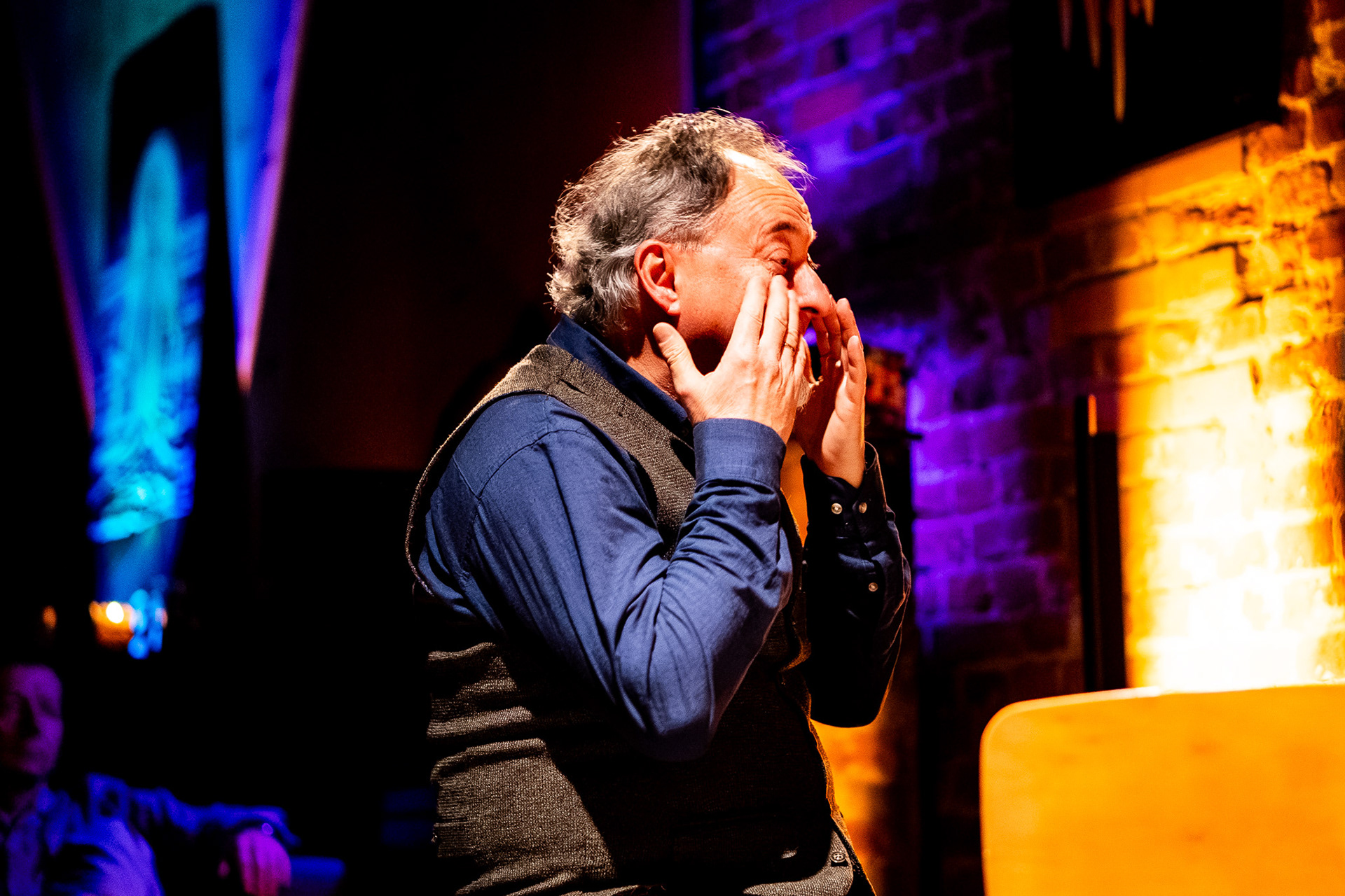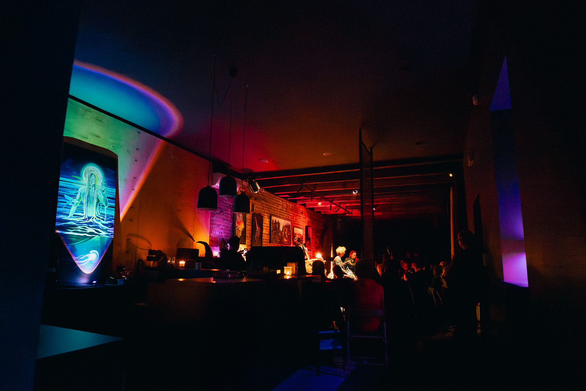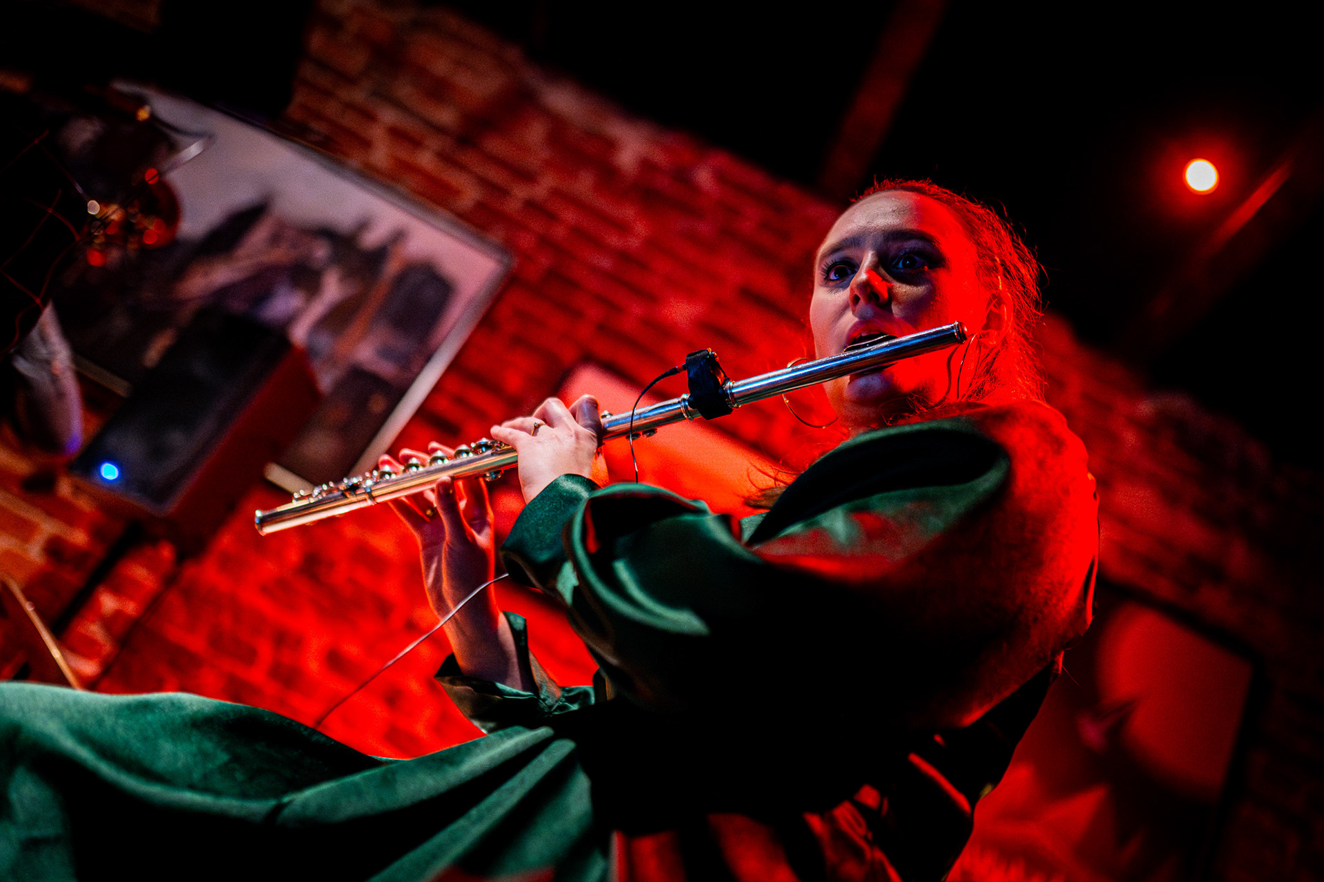 And suddenly — teleportation. From a Łódź courtyard straight into New York–Copenhagen underground. Darkness slowly parting, beams of stage light falling on a brick wall, a piano standing in the corner as if asleep, a drum set awaiting a touch, five of Piotrek’s paintings hanging like they’d always been there. Zero randomness. A minimalism so precise you feel that subtle hunger — as if everything were perfect yet just slightly too little, and at the same time, exactly right.