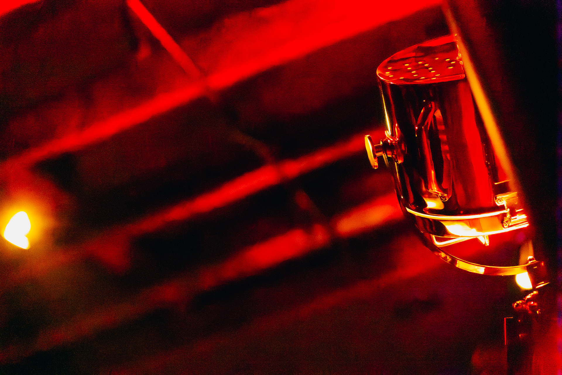 Weszliśmy. I nagle – teleportacja. Z łódzkiego podwórka do nowojorsko-kopenhaskiego undergroundu. Mrok, który powoli się rozstępuje, snopy scenicznego światła padające na ceglaną ścianę, pianino stojące w kącie jakby spało, perkusja czekająca na dotyk, pięć obrazów Piotrka wiszących jakby od zawsze. Zero przypadkowości. Minimalizm tak precyzyjny, że aż czujesz ten niedosyt – jakby wszystko było idealnie choć czegoś odrobinę za mało, a zarazem w punkt. Detale kryją się w zakamarkach: jakaś stara książka na półce z tytułem, który przeczytasz dopiero za trzecim razem, lampa na cienkich stopkach niczym tancerki baletu, czarna lada, od której odbija się światło barowych lamp.