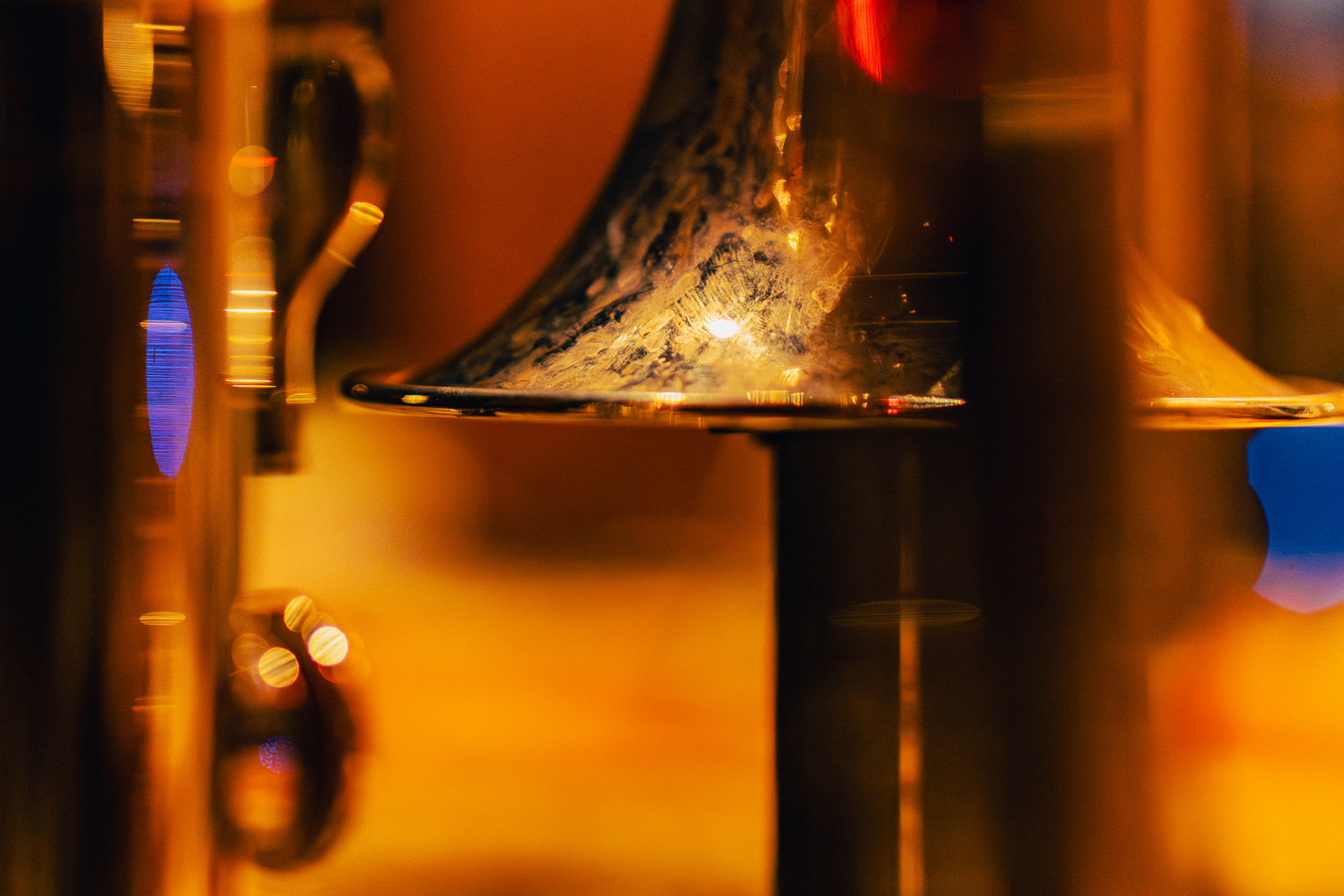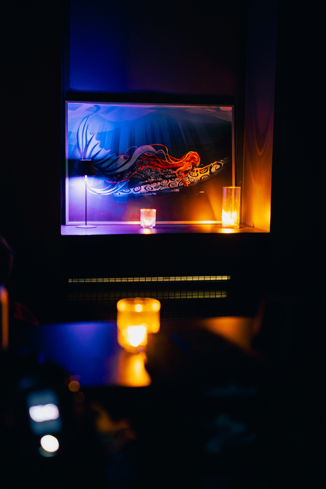 Details hide in the corners: an old book on a shelf with a title you’ll only manage to read on the third try, a lamp on thin legs like ballet dancers, a black counter catching the reflection of bar lights.